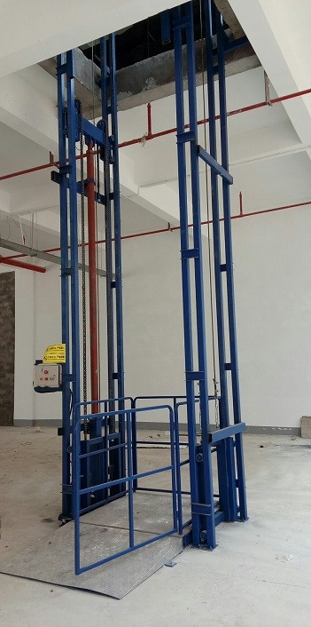 導軌鏈條升降平臺采用雙導軌單油缸,不銹鋼臺面及不銹鋼斜坡,2樓帶機械自動門,升降平臺主要用于樓層之間上下貨物、可以不挖地坑,離地高度小,便于上下貨物,是升降運輸貨物的好幫手。